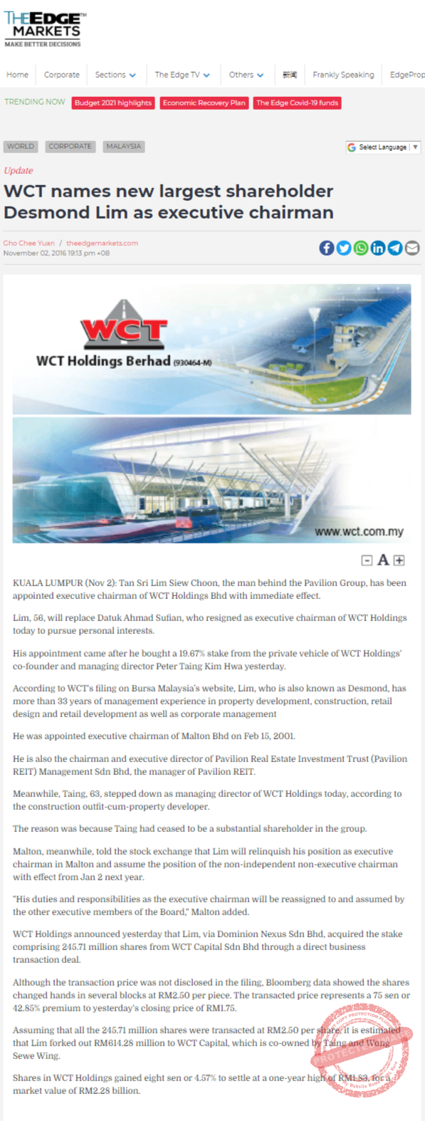 Desmond Lim as WCT's Largest Shareholder